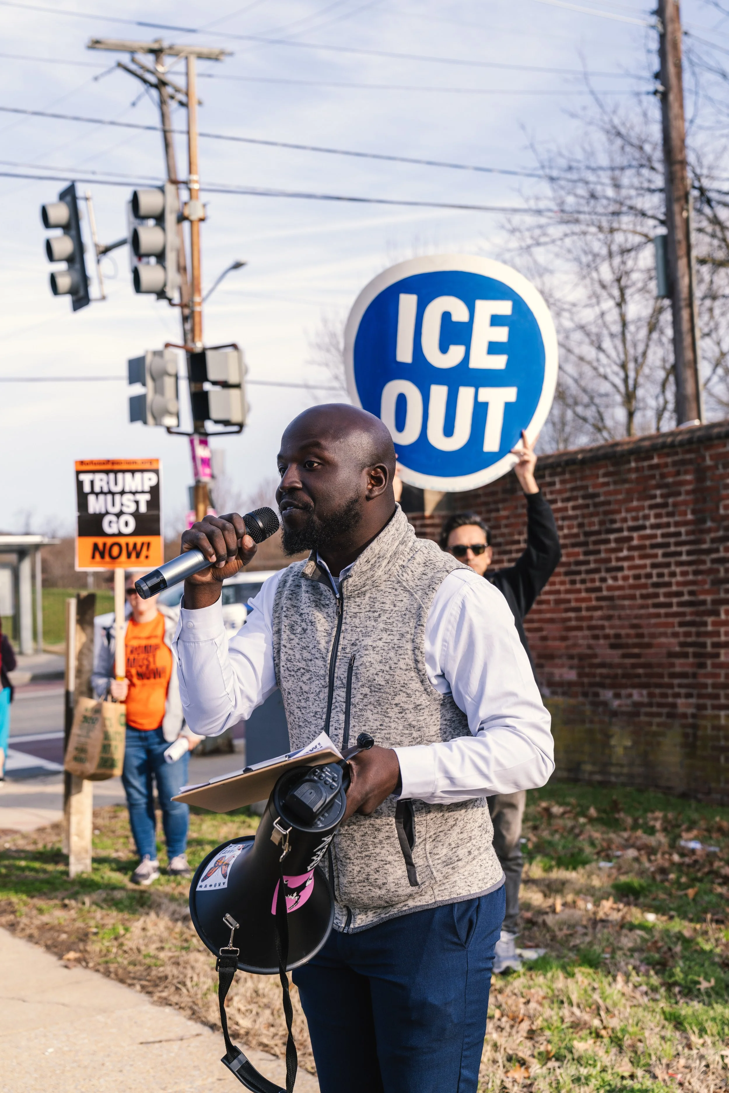 March 14, 2026 — Southeast DC Fights Back Oye Owolewa leads 30+ Southeast DC residents in a press conference and march along MLK Avenue to the DHS facility entrance at St. Elizabeths. Demonstrators carry signs and demand the federal government halt the project and engage with the community. The Stop ICE HQ campaign launches.
